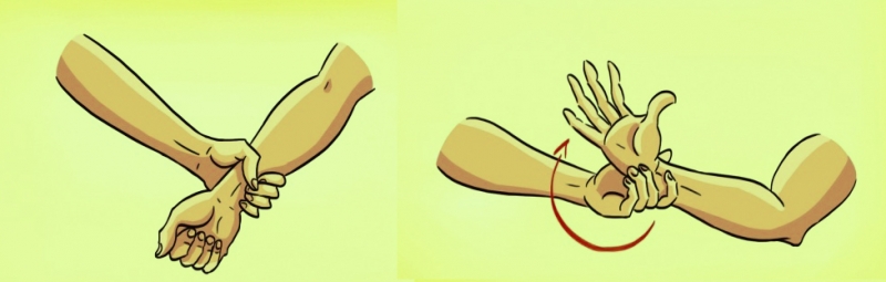 Если кто-то схватил вас за кисть, поверните руку в сторону, где соединяются большой и указательный пальцы противника – самое слабое место захвата.