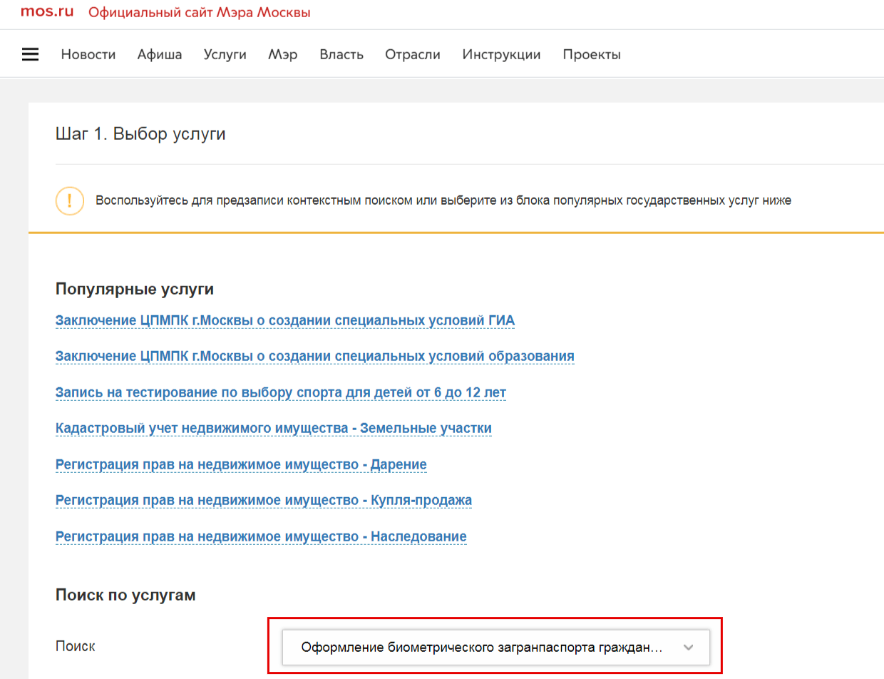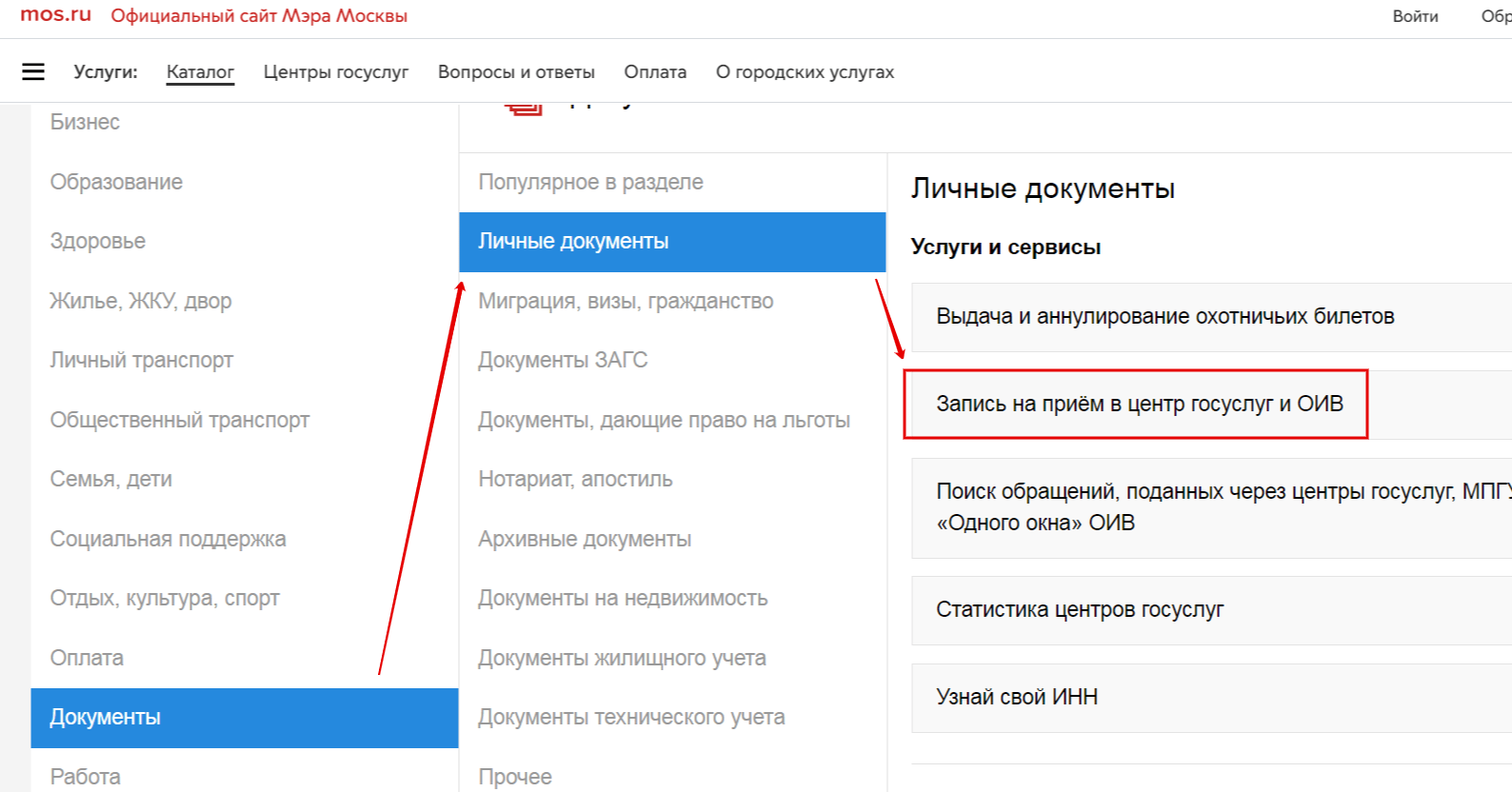 (Услуги – Документы – Личные документы – Запись на прием в центры госуслуг и ОИВ)